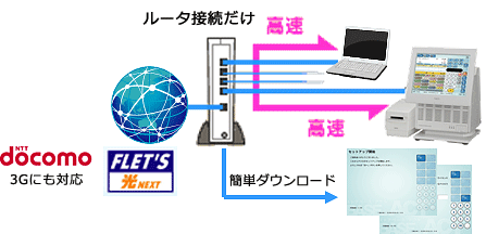 設置はルーターに接続するだけ、POSソフトウエアは、インターネットから簡単にダウンロード。